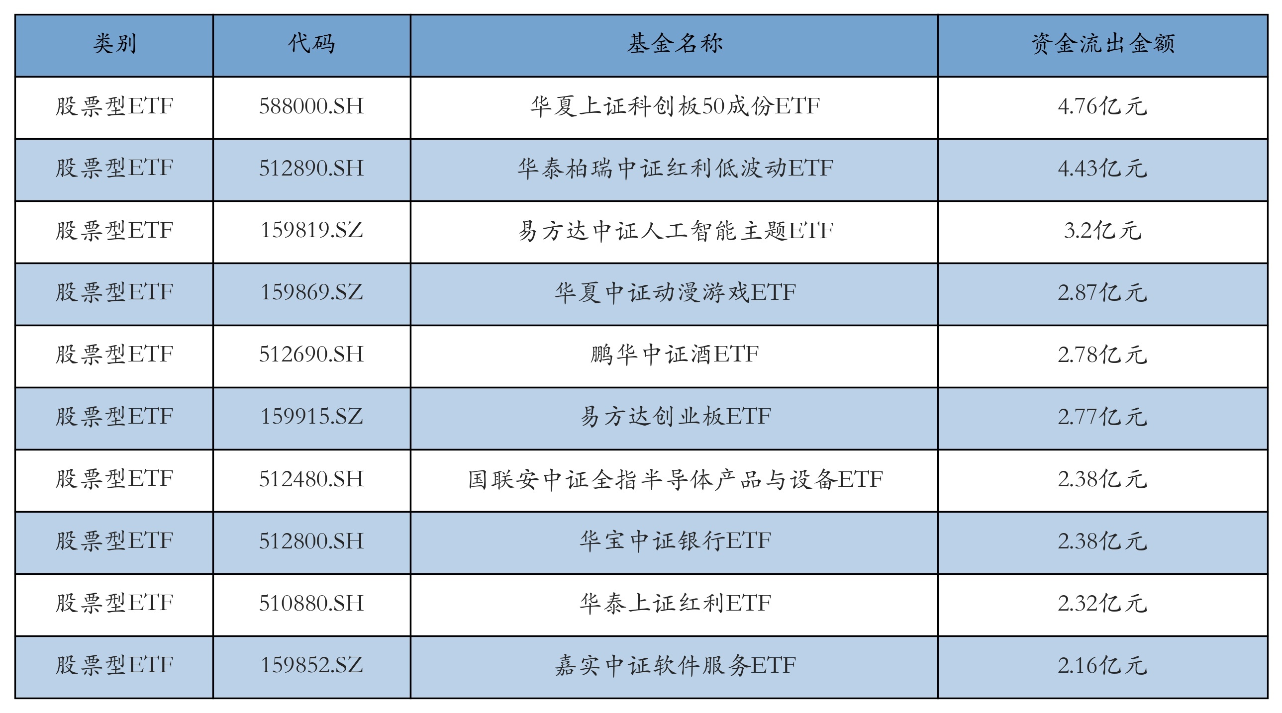 昨日股票型ETF资金流出最多的3只ETF及其流出金额分别为:华夏上证科创板50成份ETF(流出4.76亿元)、华泰柏瑞中证红利低波动ETF(流出4.43亿元)、易方达中证人工智能主题ETF(流出3.2亿元)。资金流出前10详情见下表: