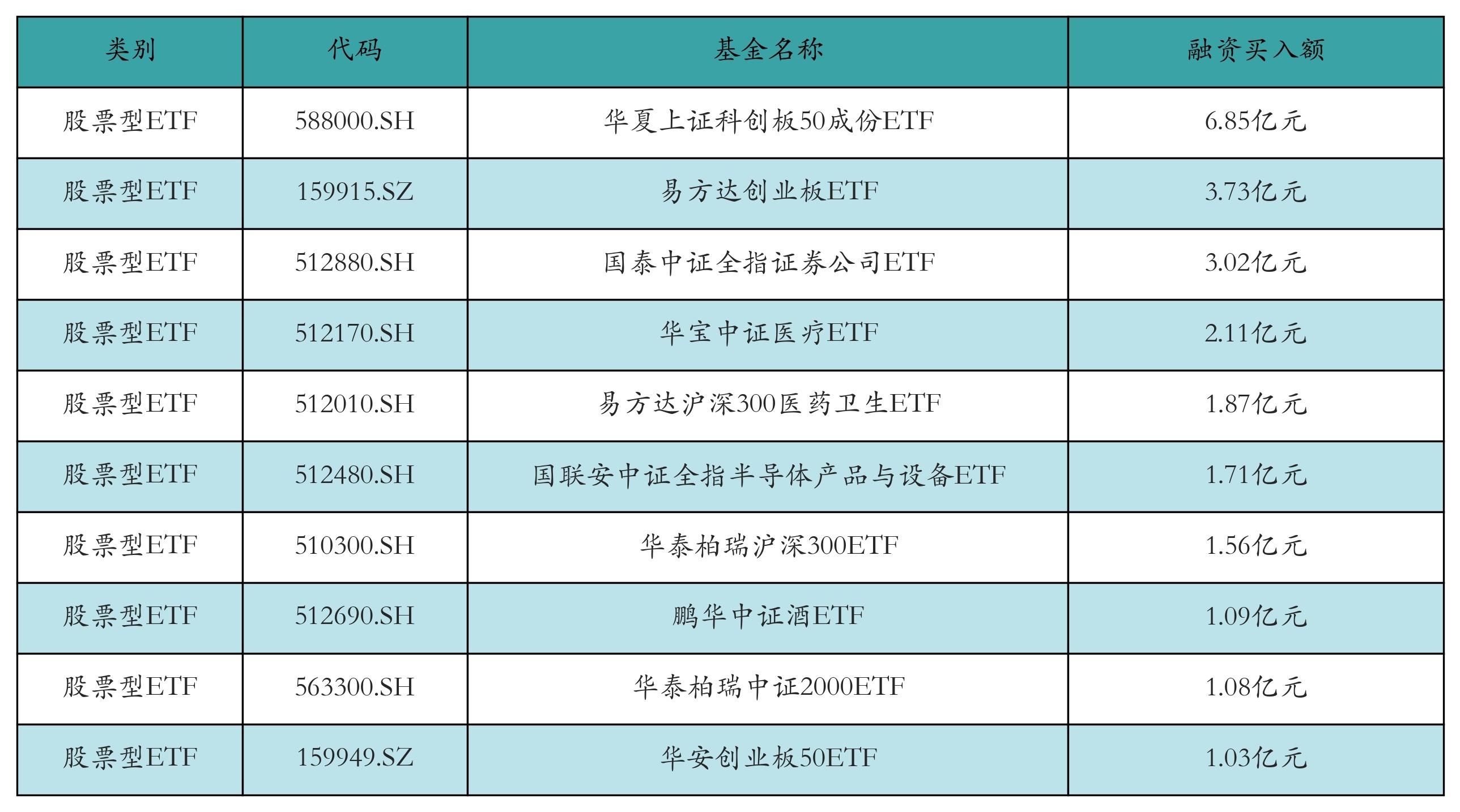 昨日股票型ETF融资买入额最高的3只ETF及其买入金额分别为:华夏上证科创板50成份ETF(6.85亿元)、易方达创业板ETF(3.73亿元)、国泰中证全指证券公司ETF(3.02亿元)。融资买入额前10详情见下表: