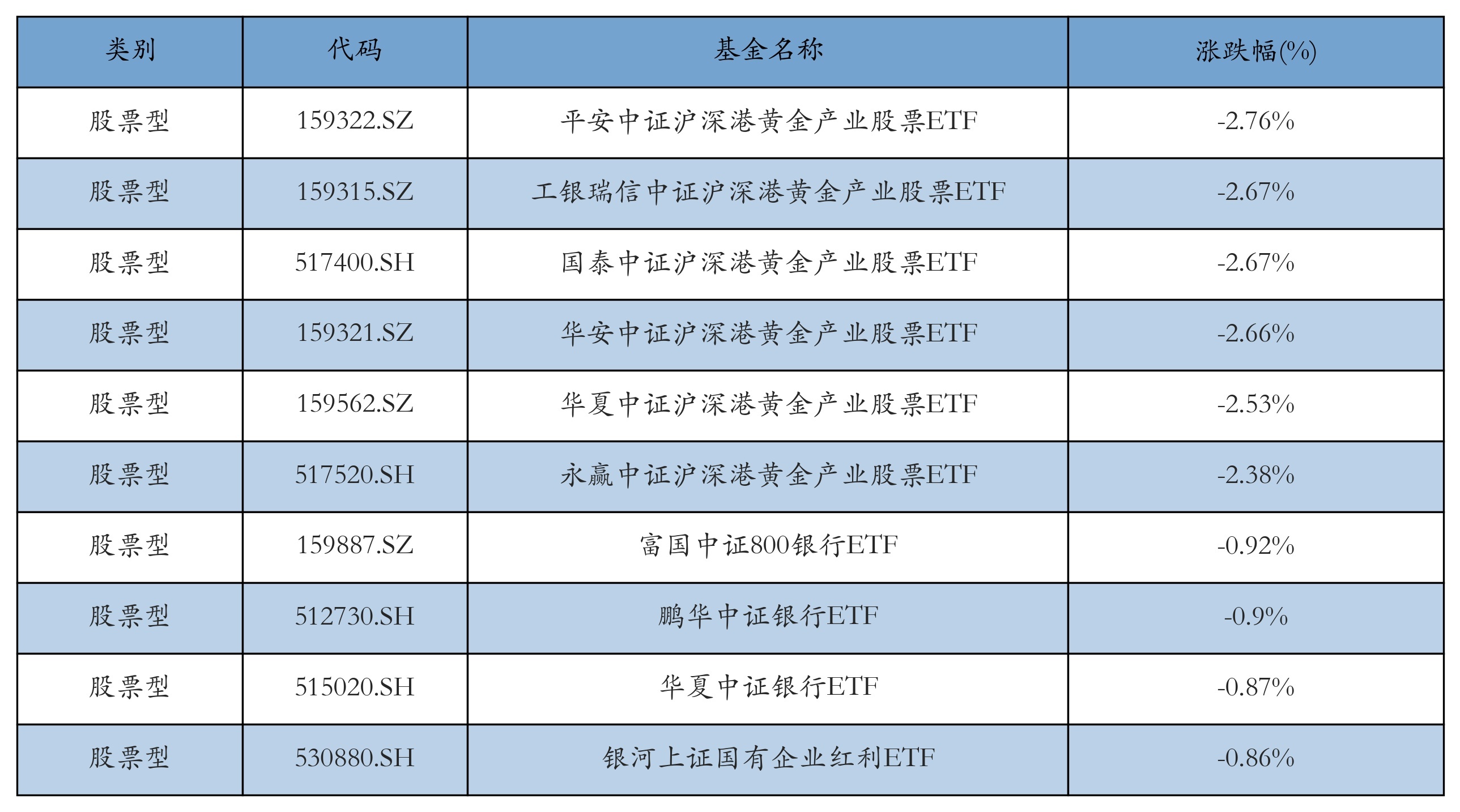 昨日股票型ETF跌幅最大的3只ETF及其收益率分别为:平安中证沪深港黄金产业股票ETF(-2.76%)、工银瑞信中证沪深港黄金产业股票ETF(-2.67%)、国泰中证沪深港黄金产业股票ETF(-2.67%)。跌幅前10详情见下表: