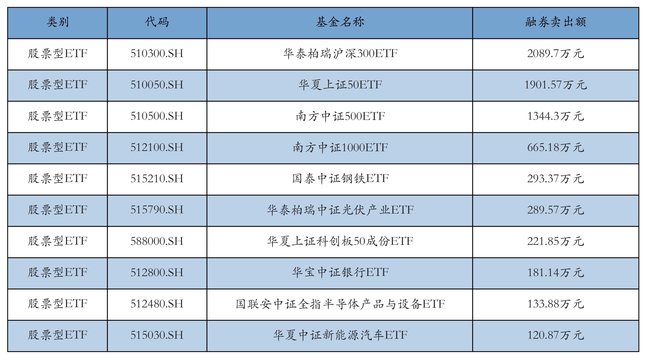 昨日股票型ETF融资卖出额最高的3只ETF及其卖出金额分别为:华泰柏瑞沪深300ETF(2089.7万元)、华夏上证50ETF(1901.57万元)、南方中证500ETF(1344.3万元)。融券卖出额前10详情见下表: