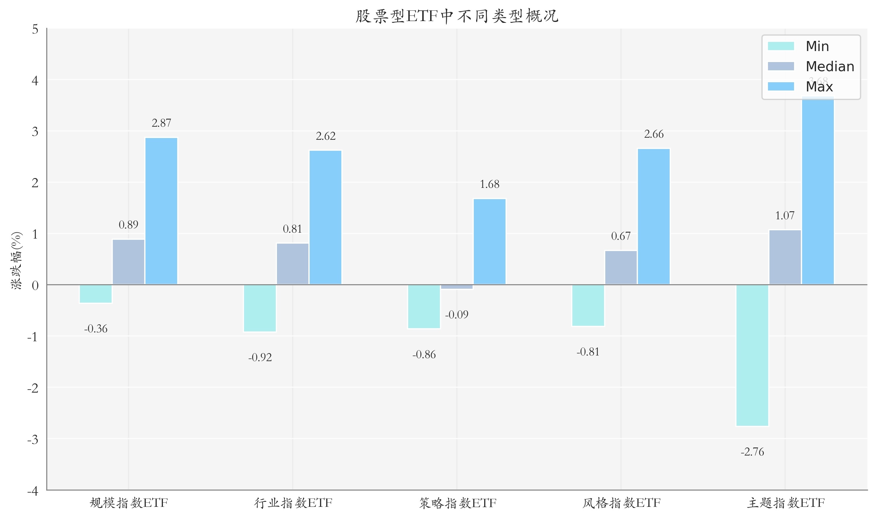 昨日股票型ETF收益率中位数为0.87%。其中按照不同分类,规模指数ETF中,鹏华上证科创板100ETF收益率最高,为2.87%;行业指数ETF中,南方中证新能源ETF收益率最高,为2.62%;策略指数ETF中,中金MSCI中国A股国际质量ETF收益率最高,为1.68%;风格指数ETF中,易方达创业板成长ETF收益率最高,为2.66%;主题指数ETF中,华夏中证新能源汽车ETF收益率最高,为3.68%。