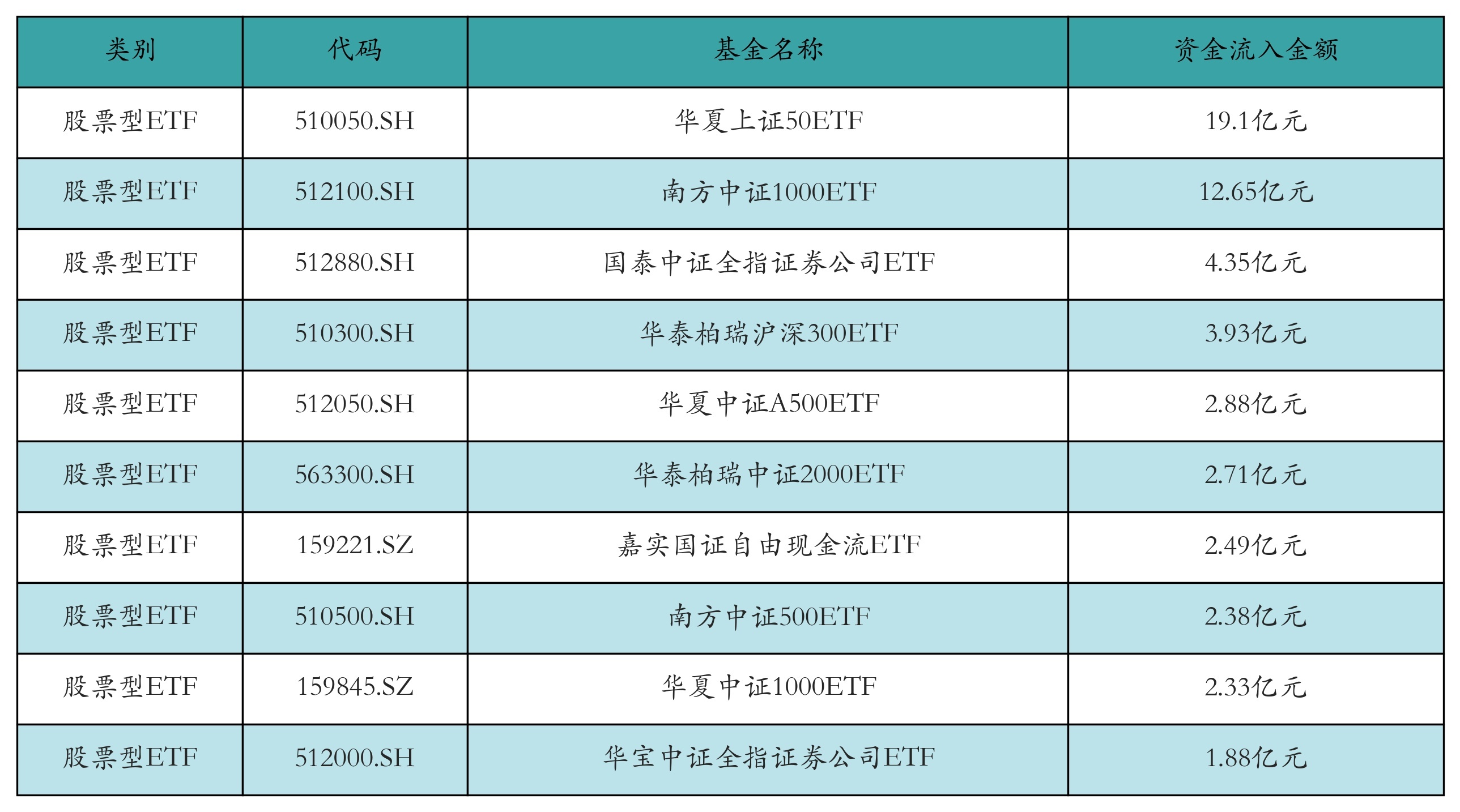 昨日股票型ETF资金流入最多的3只ETF及其流入金额分别为:华夏上证50ETF(流入19.1亿元)、南方中证1000ETF(流入12.65亿元)、国泰中证全指证券公司ETF(流入4.35亿元)。资金流入前10详情见下表: